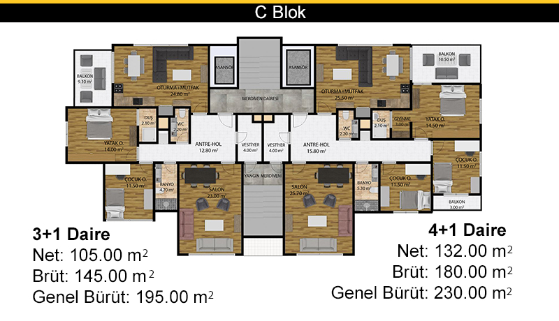 - 3+1 , 4+1 ve Her kat tek 4+1 Geniş daireler